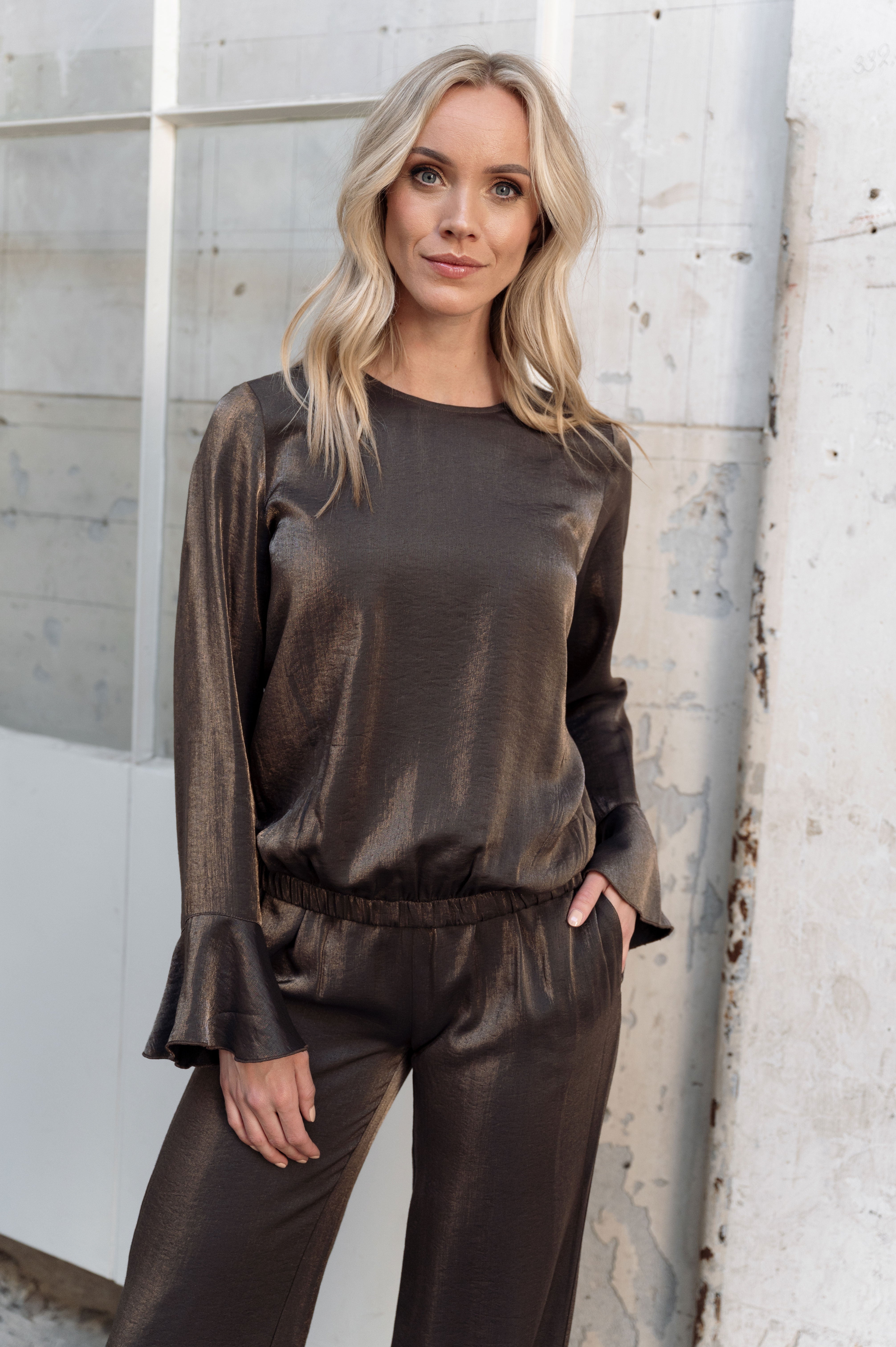 Deze blouse heeft een vrouwelijk uitlopend mouwtje en een elastieken band aan de onderkant voor een mooie, blousende pasvorm. De glans in de stof geeft de blouse een chique uitstraling. Verkrijgbaar in meerdere kleuren.
