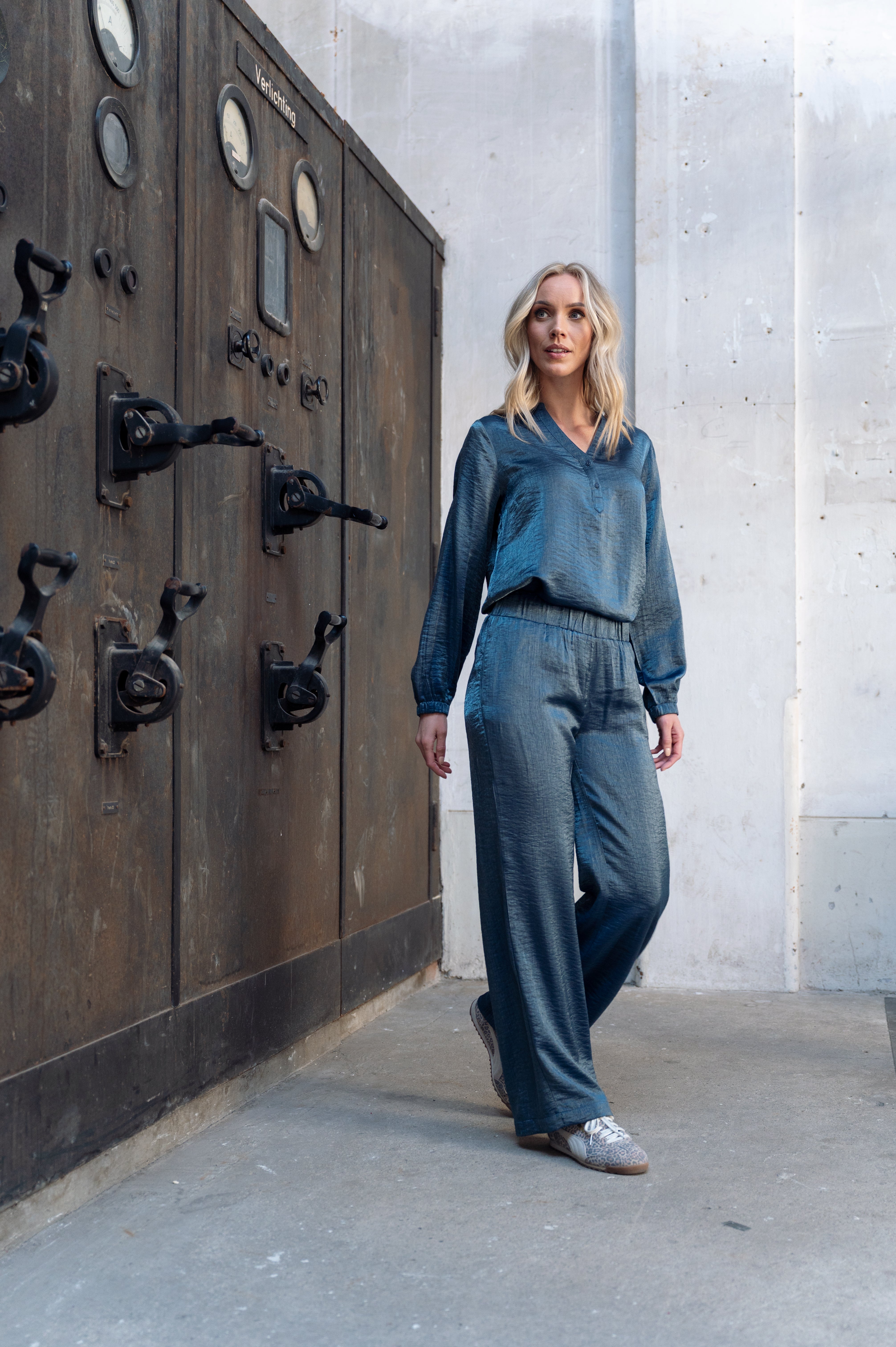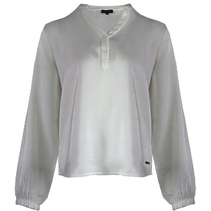 Deze blouse heeft een elegante V-hals met knoopjes en is afgewerkt met elastiek bij de mouwen voor een comfortabele en vrouwelijke fit. Een veelzijdig model dat makkelijk te combineren is. Verkrijgbaar in meerdere kleuren.