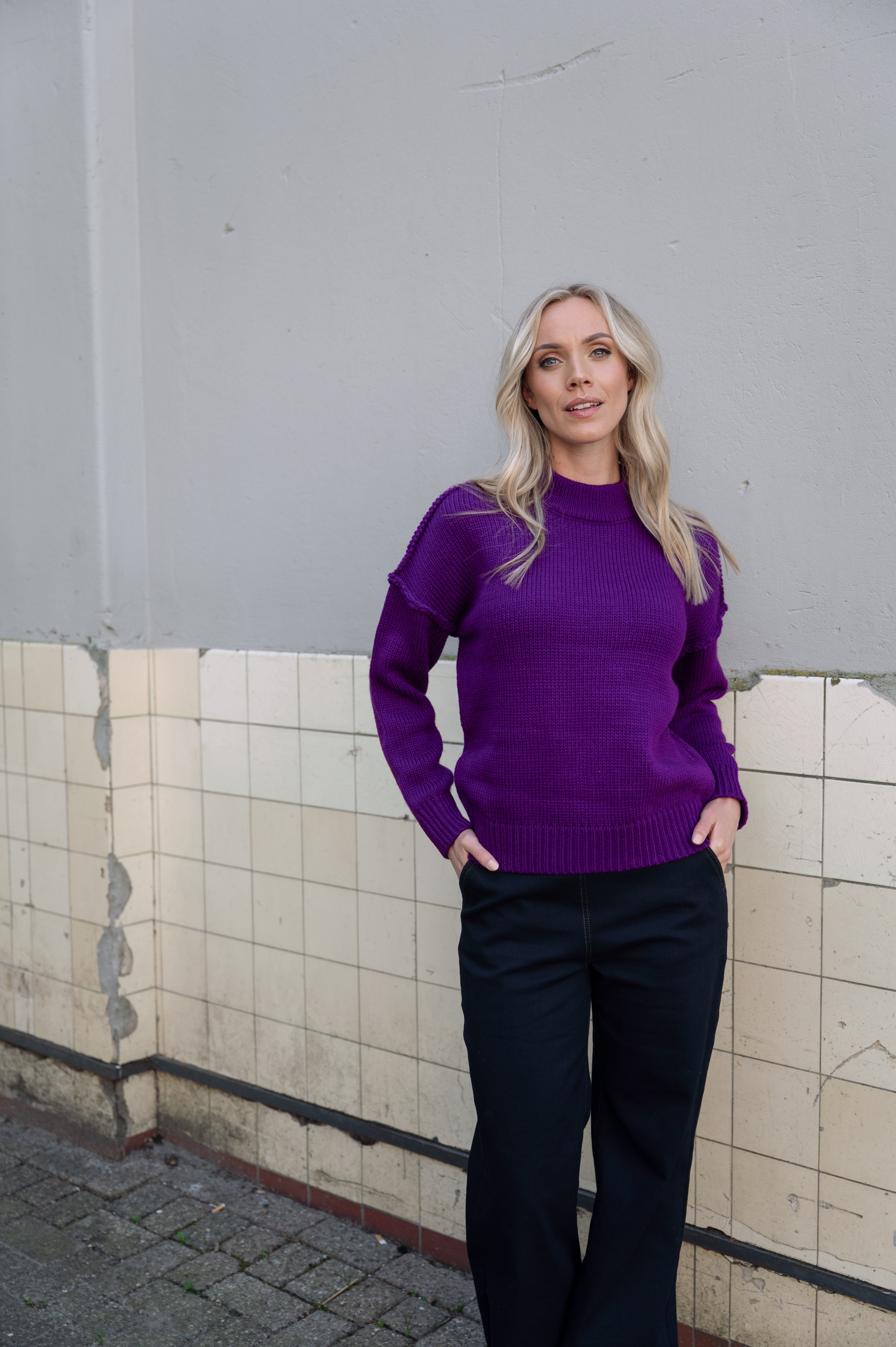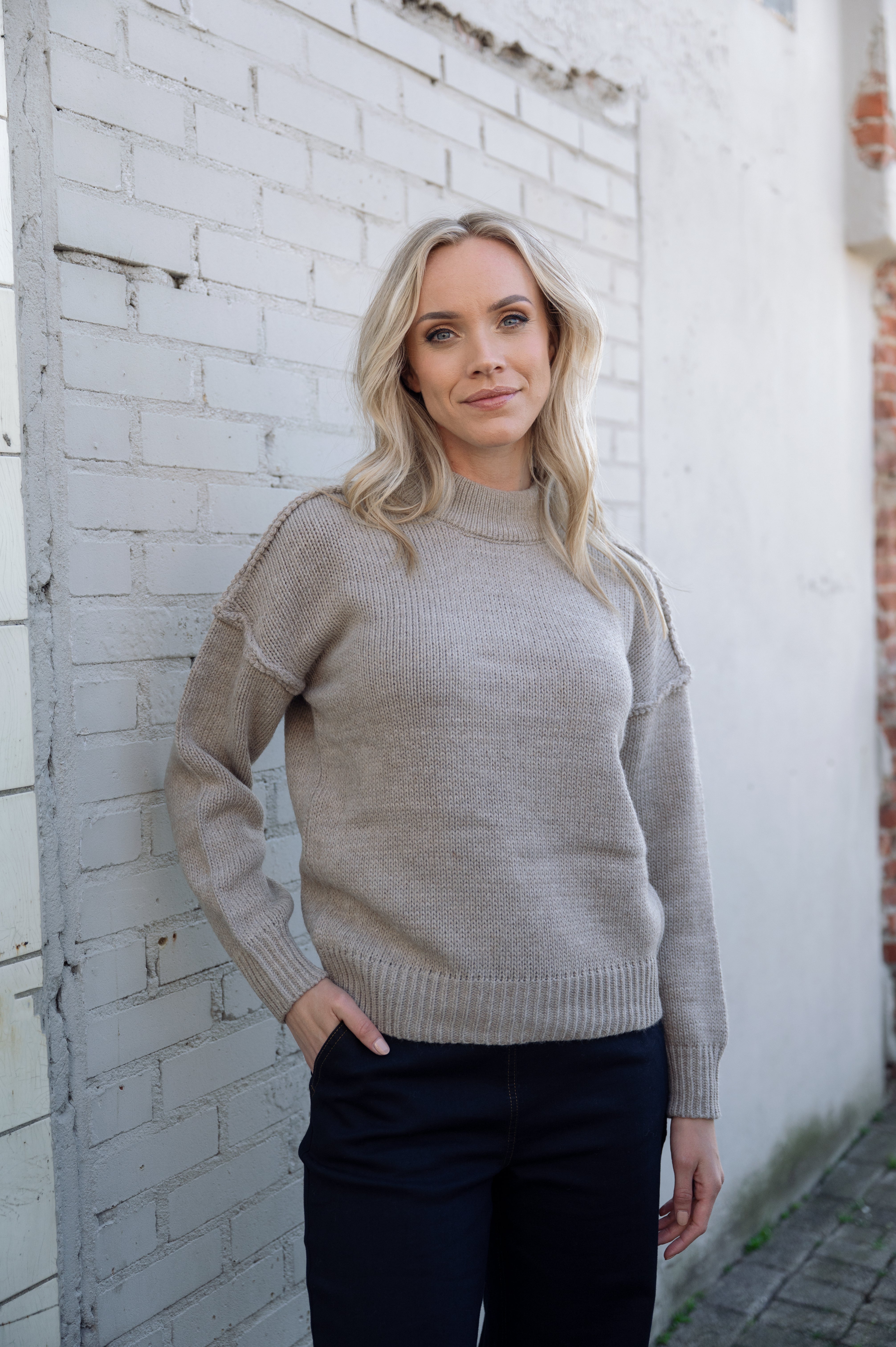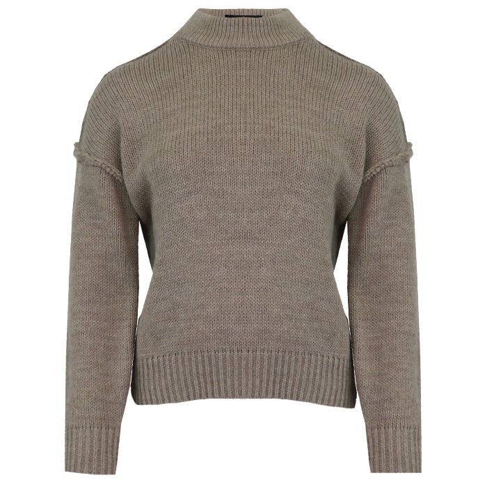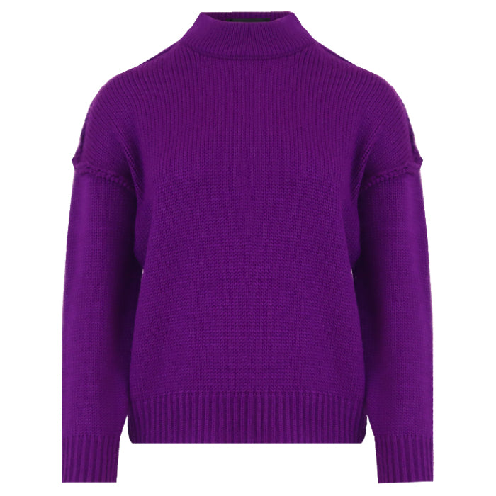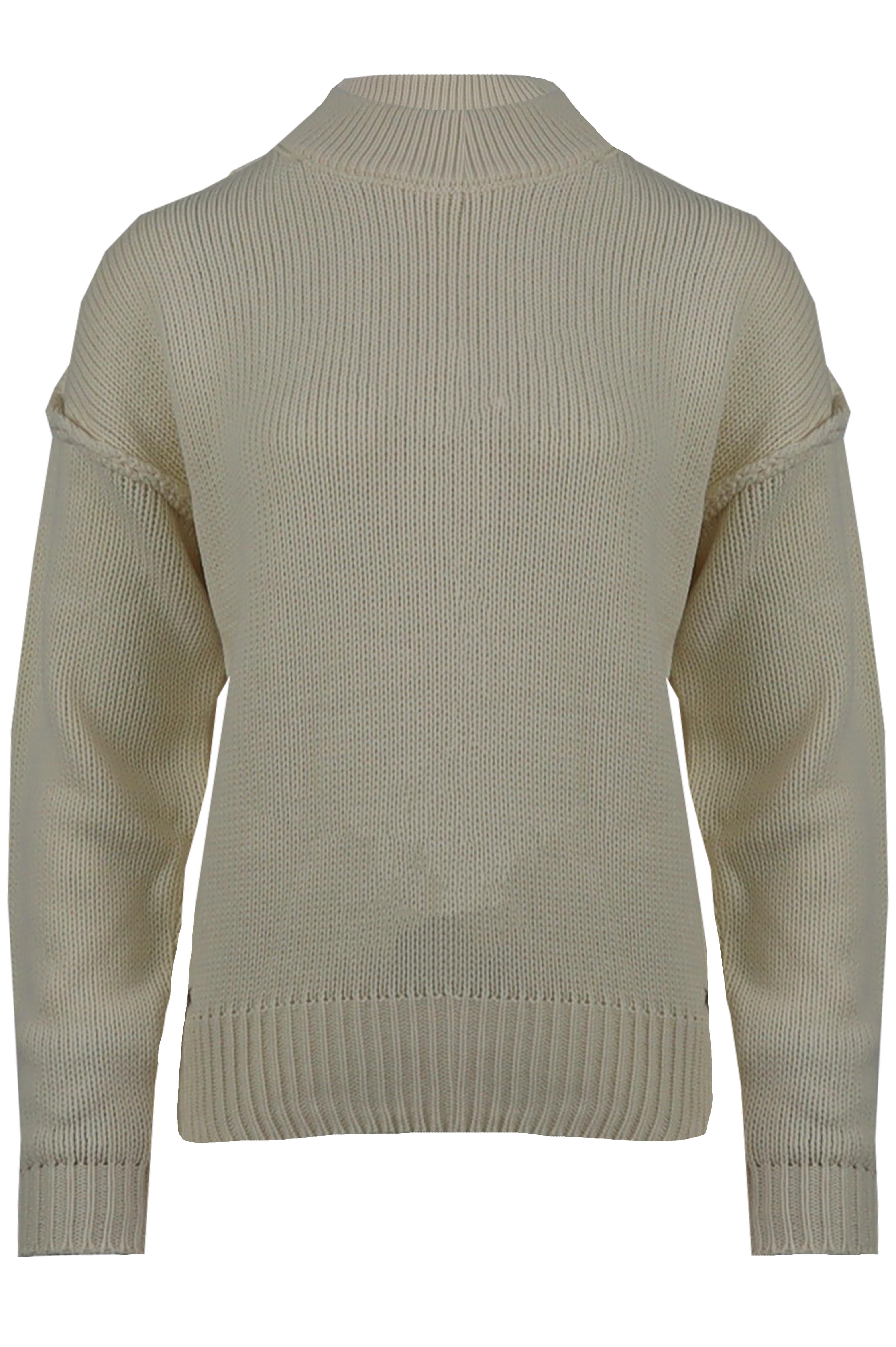 Deze grofgebreide trui is heerlijk warm en heeft een stoer stiksel als detail. De hoge kraag geeft extra comfort en maakt de trui perfect voor koudere dagen. Verkrijgbaar in meerdere kleuren.