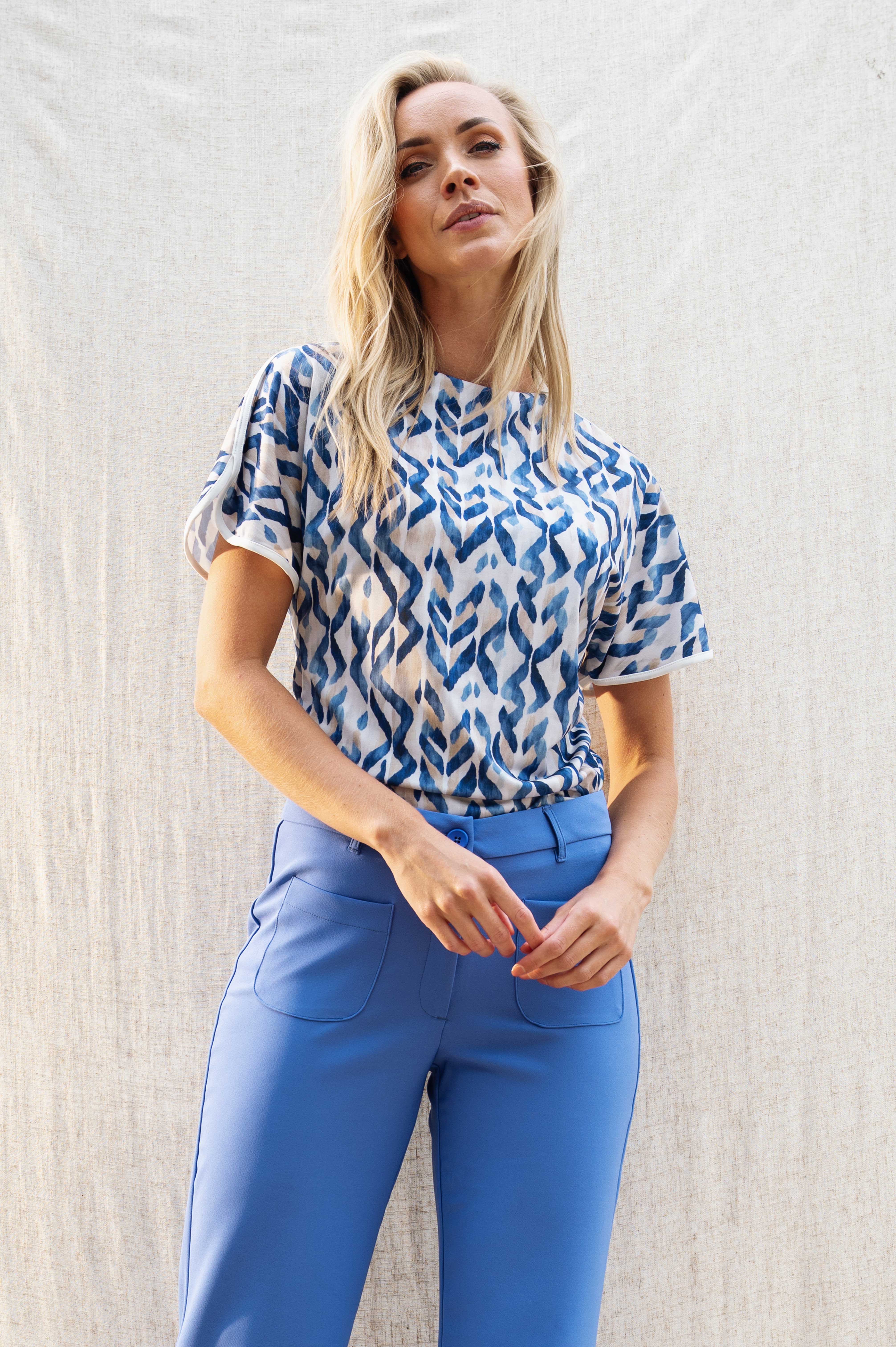 Top Isla is een chique basic met korte mouw, gemaakt van soepel travelmateriaal. De hoge hals en subtiele bies geven een verfijnde touch. Verkrijgbaar in meerdere kleuren.
