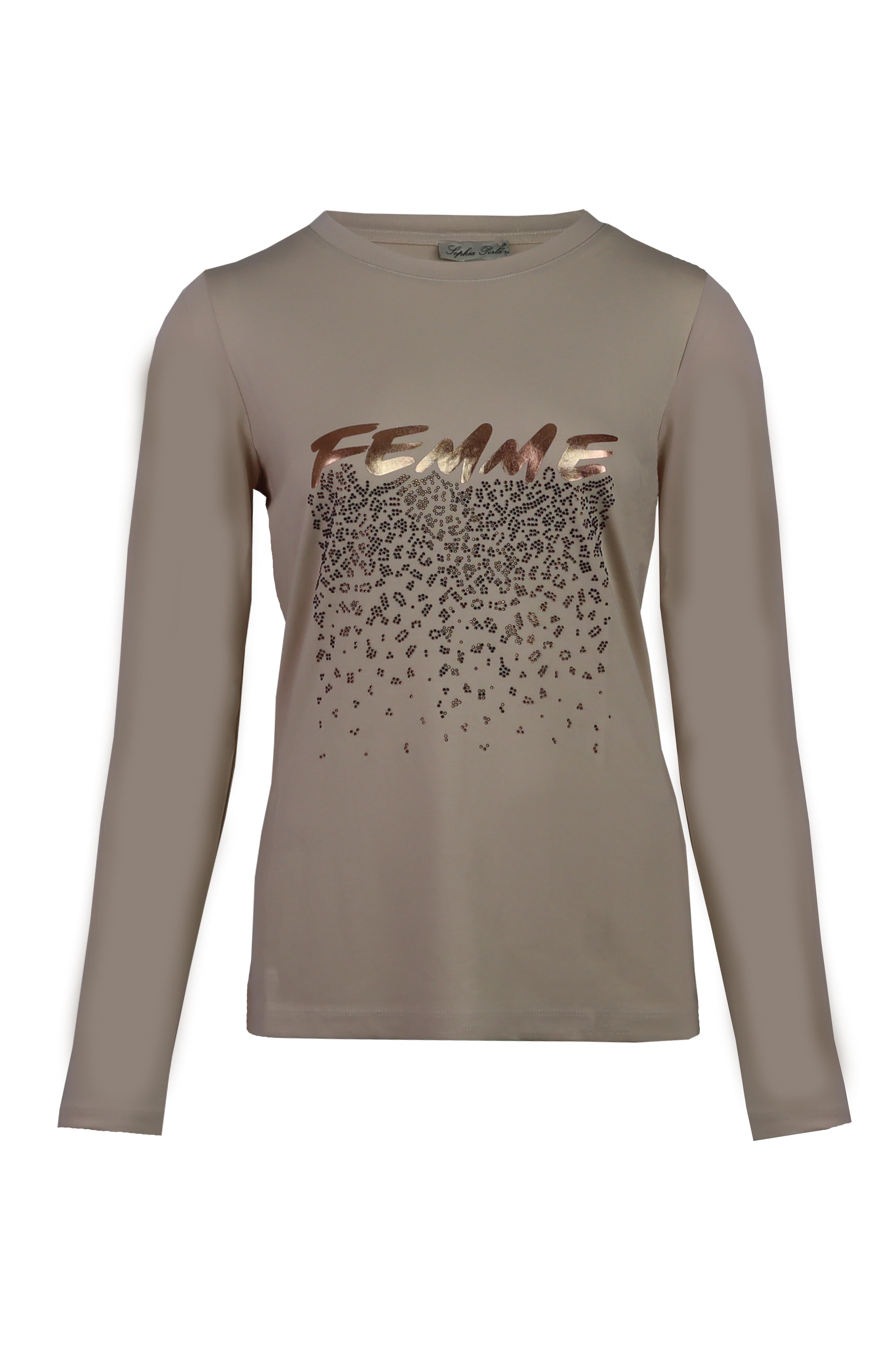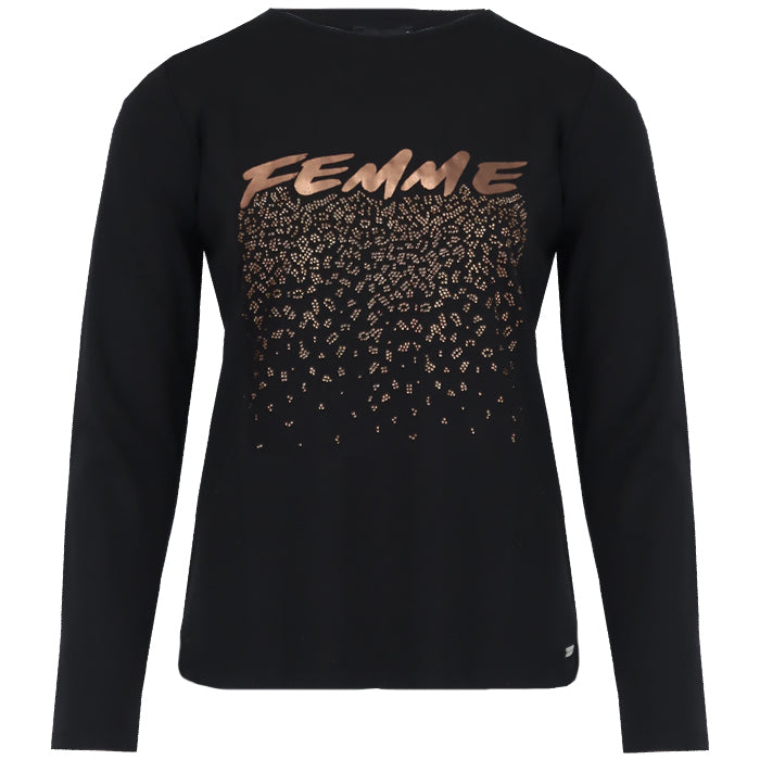 Deze trendy zwarte top is voorzien van een metallic opdruk, wat zorgt voor een stoere en tegelijkertijd stijlvolle uitstraling. De top is zowel veelzijdig als comfortabel, en kan gemakkelijk worden gecombineerd met verschillende outfits. Verkrijgbaar in meerdere kleuren.
