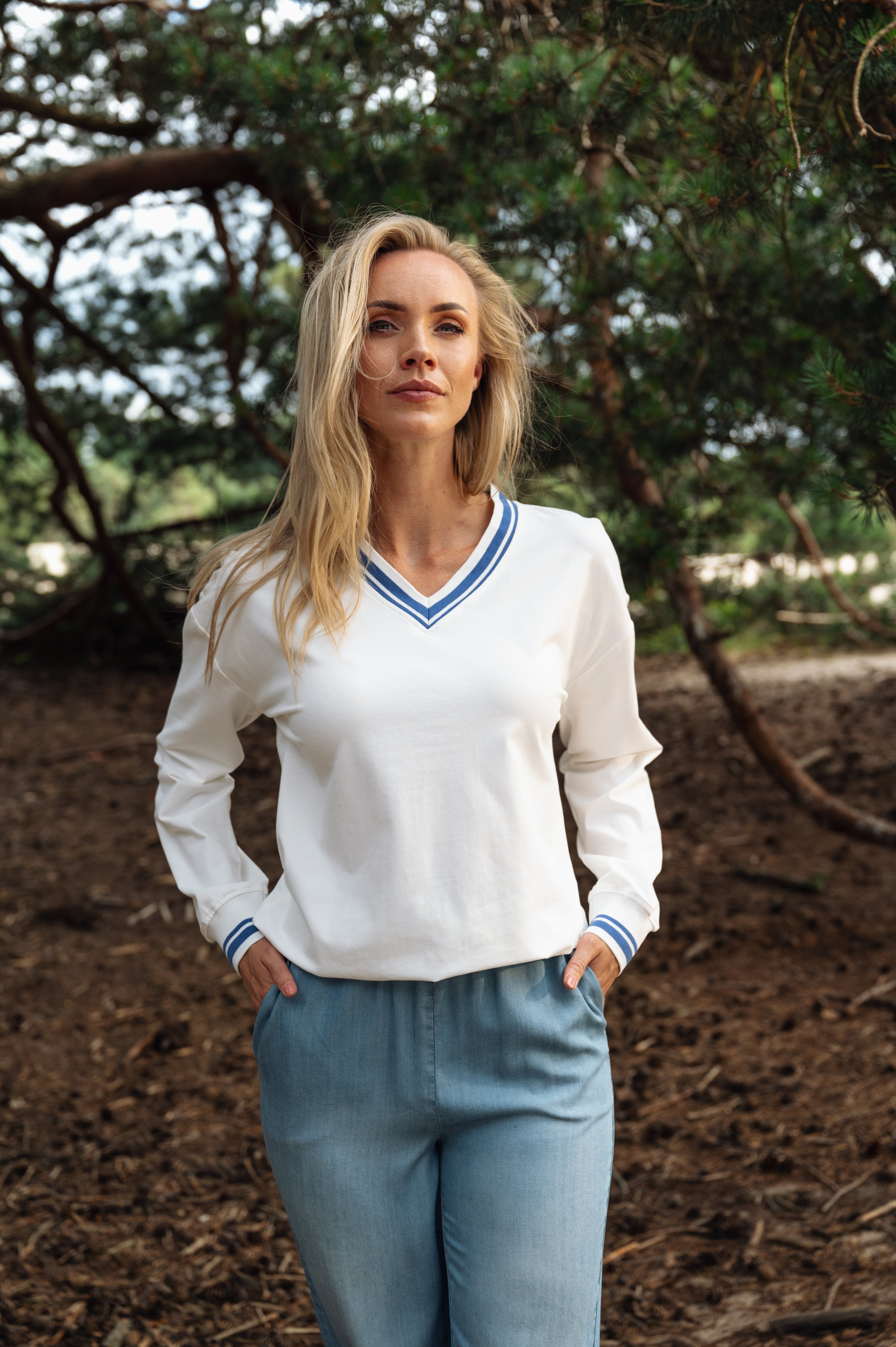 De Fabia sweater combineert een sportieve uitstraling met een luxe afwerking. Het tijdloze offwhite wordt verfrist door subtiele blauwe details langs de V-hals en mouwen, waardoor de sweater net dat beetje extra krijgt. De zachte stof en comfortabele pasvorm maken dit een ideaal item voor iedere dag, terwijl het elegante design ervoor zorgt dat hij seizoen na seizoen stijlvol blijft. Verkrijgbaar in meerdere kleuren.