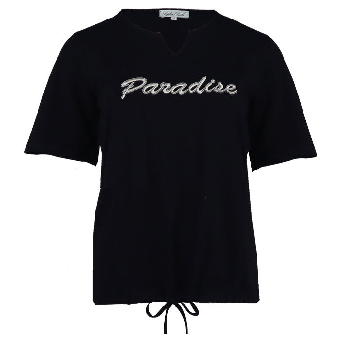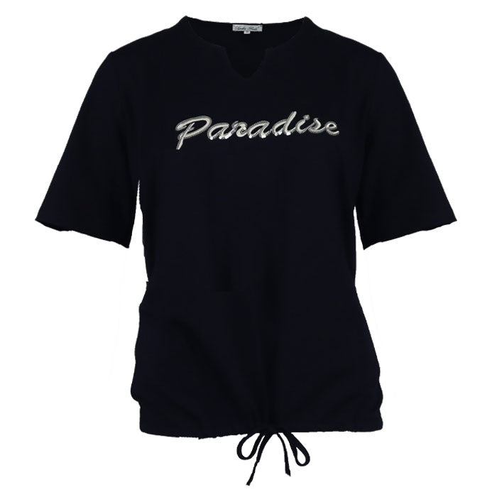 Top Felisia heeft een vrouwelijke V-hals en korte mouwen, afgewerkt met een speels touwtje aan de onderkant om te strikken. Het subtiele glitterdetail geeft net dat beetje extra sparkle. Gemaakt van zacht katoen. Verkrijgbaar in meerdere kleuren.