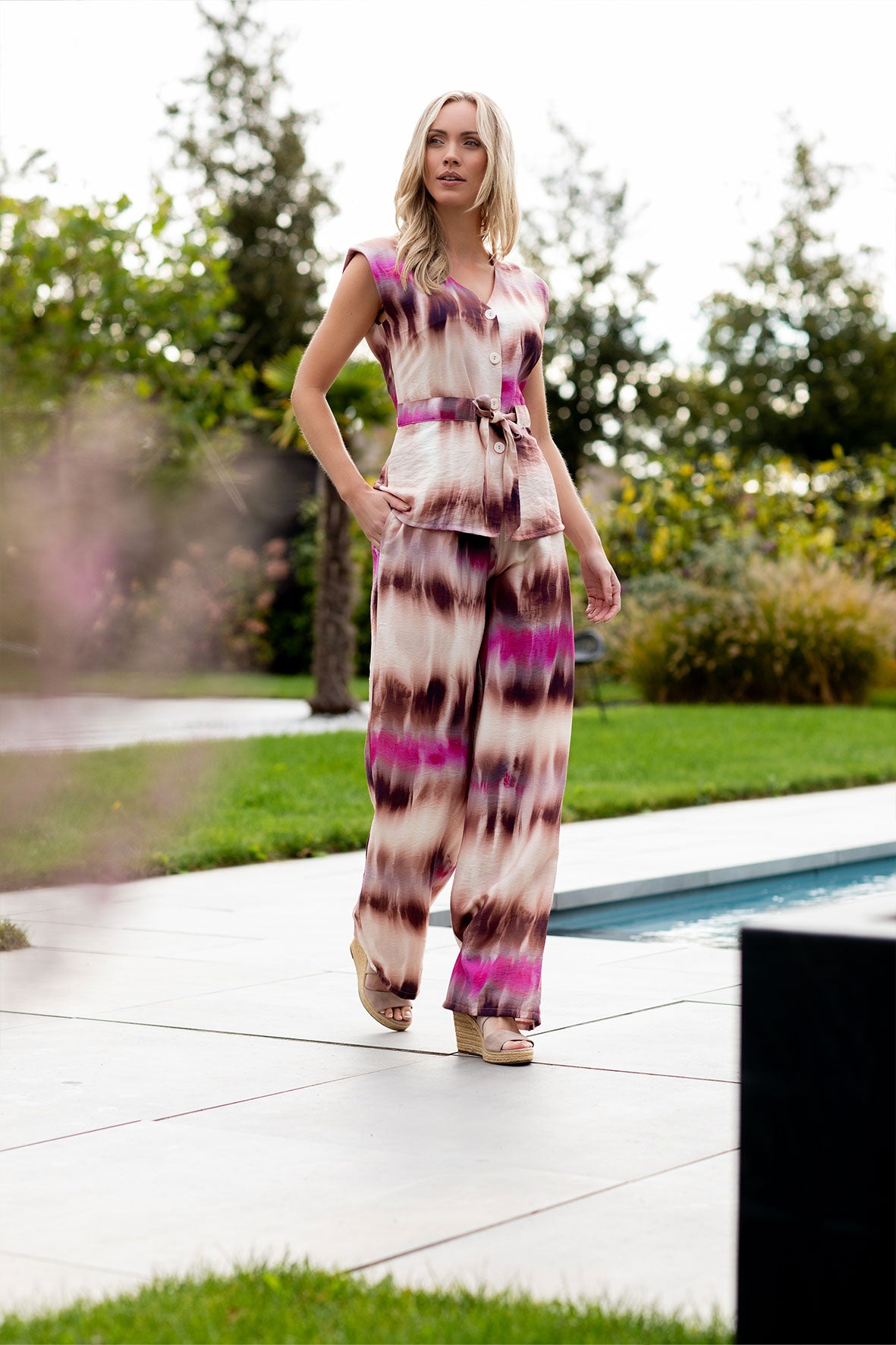 This top features buttons and a tie cord for a playful, feminine look. The design offers style and comfort, perfect for a casual yet sophisticated look. Available in multiple prints.