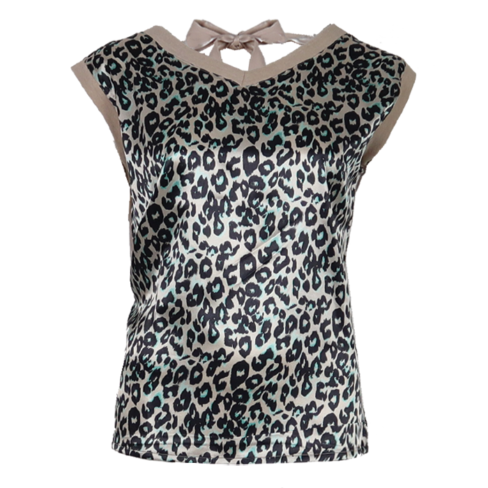 The Gianna top is super trendy and has a panther print in a shiny fabric. The bow on the back and the finishing with borders make it a playful and chic choice for a fashion-forward look.