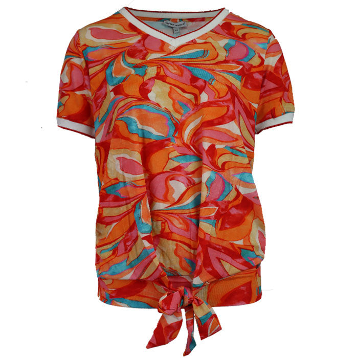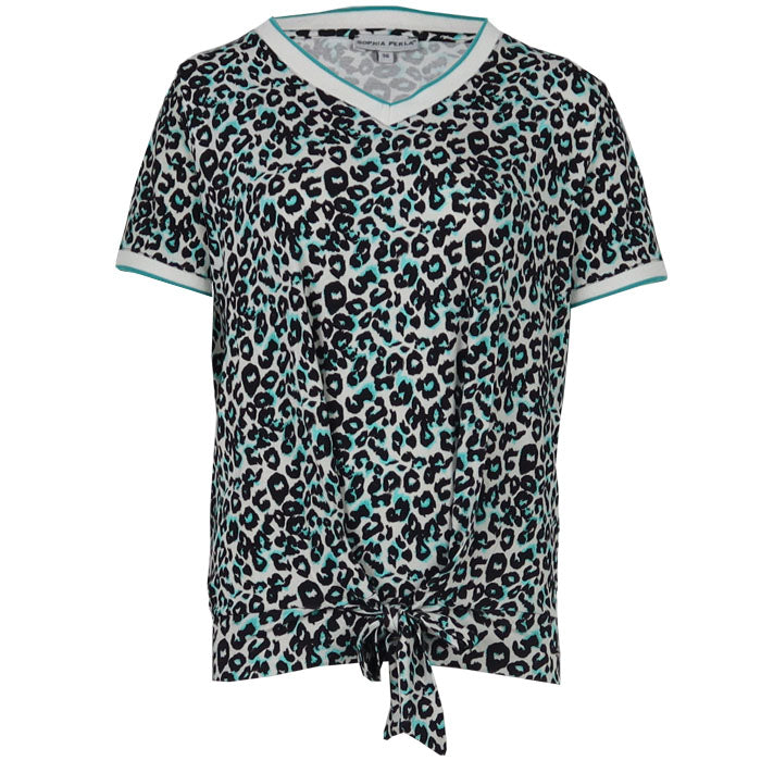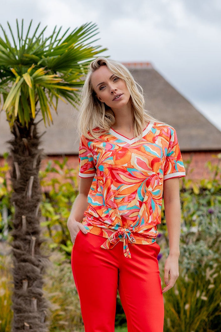 The t-shirt has an elasticated waistband with a bow for a playful, feminine finish. The sleeves and V-neck are specially finished for a unique look. This t-shirt combines comfort with style and is perfect for a casual yet chic outfit. Available in multiple prints.