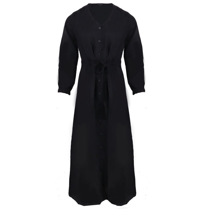 De Fabienne jurk heeft een V-hals en een trekkoord om de taille te accentueren, waardoor het een flatterende pasvorm heeft. Perfect voor een elegante maar comfortabele look! Verkrijgbaar in meerdere kleuren.