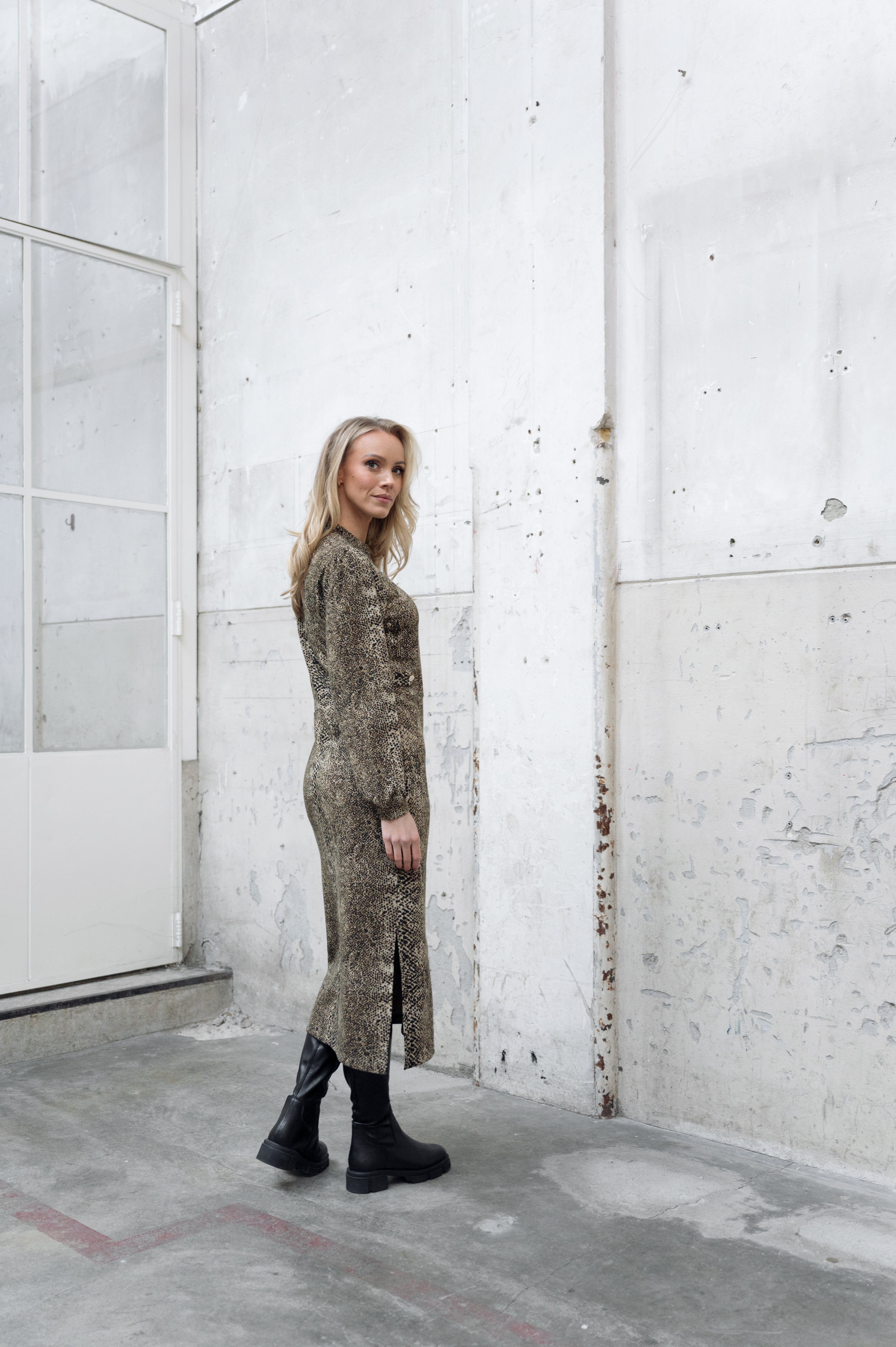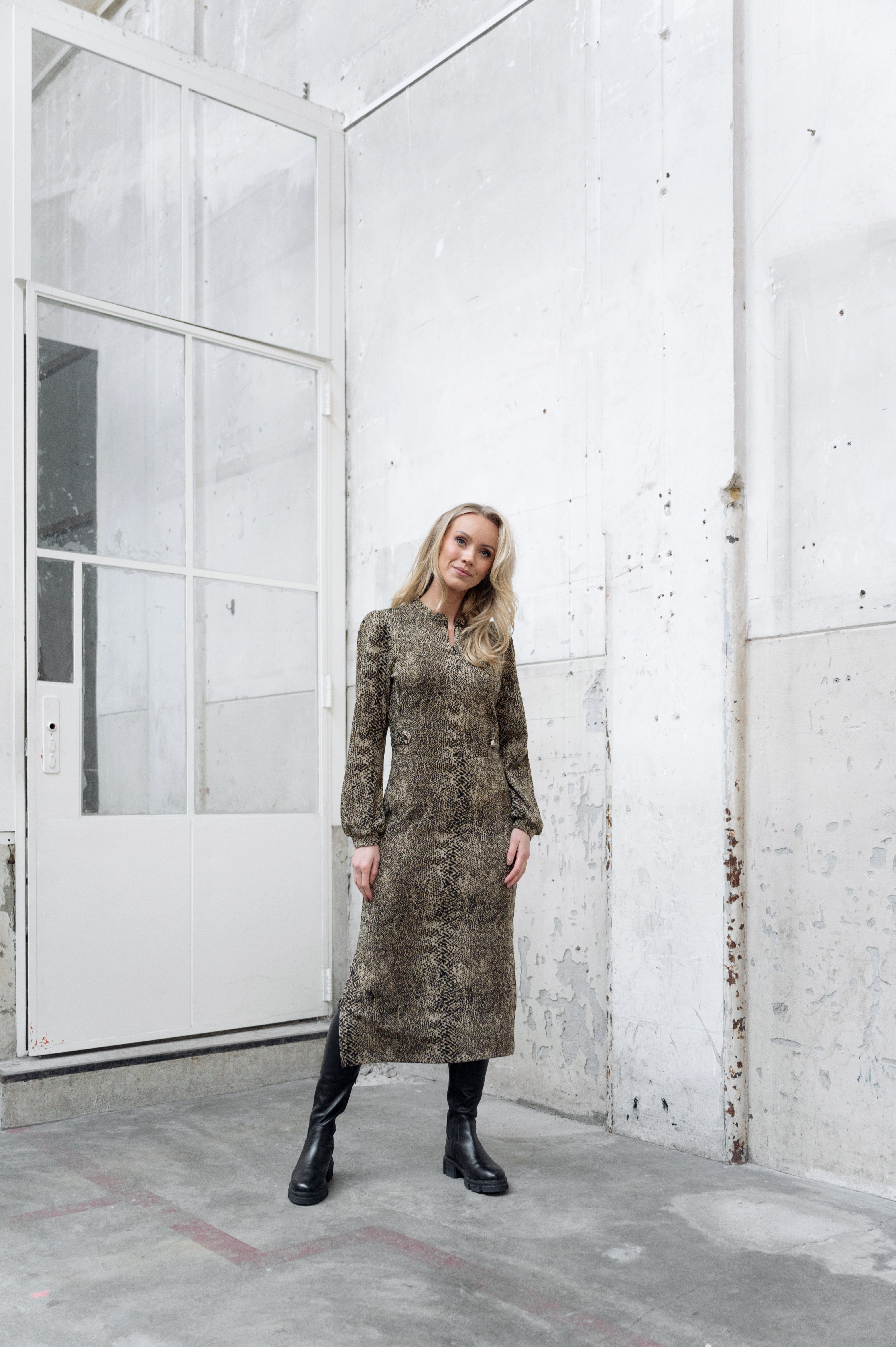 Midi-jurk Richelle heeft een subtiele rits aan de voorkant die tot de taille loopt, met een naad die de taille mooi accentueert. De lange mouwen zijn voorzien van lichte plooien en een subtiel knoopdetail aan de zijkant, wat de jurk een verfijnde en moderne uitstraling geeft. Perfect voor elke gelegenheid, verkrijgbaar in meerdere prints.