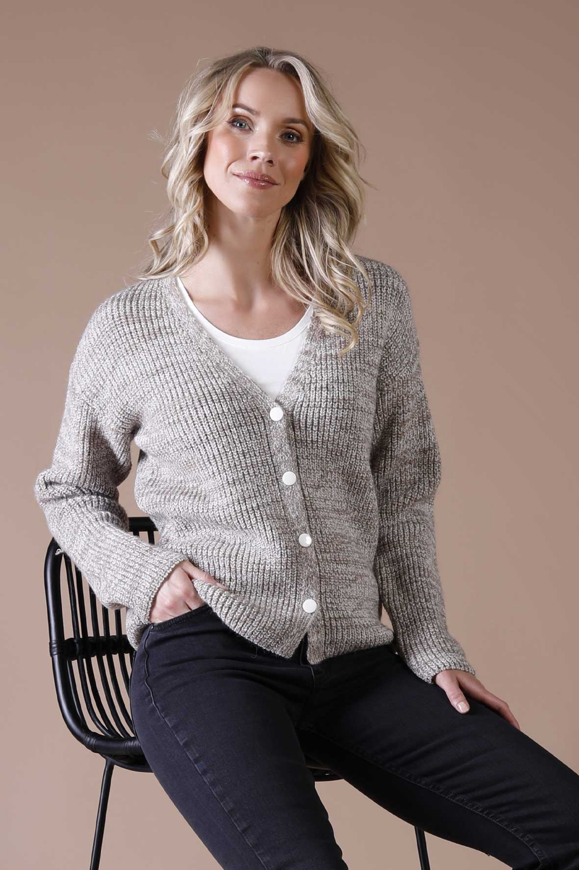 The Elora cardigan has a melange color, buttons and a V-neck, and is made of fine knit for a comfortable and chic look. Perfect for any occasion.