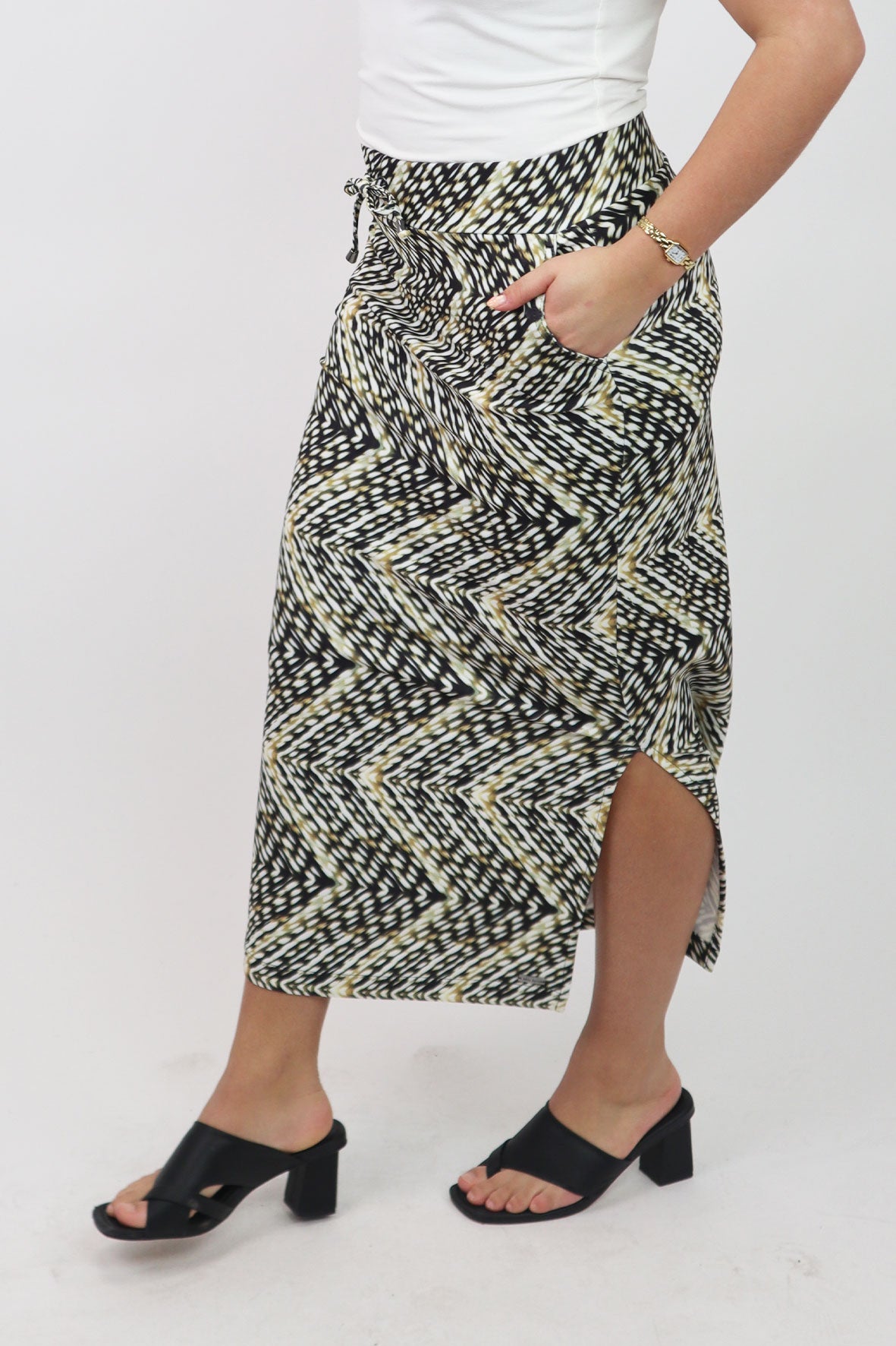 The London skirt is a midi length in a soft fabric with stretch. The design features a drawstring and a split on both sides for a comfortable and fashionable look. Available in multiple prints.