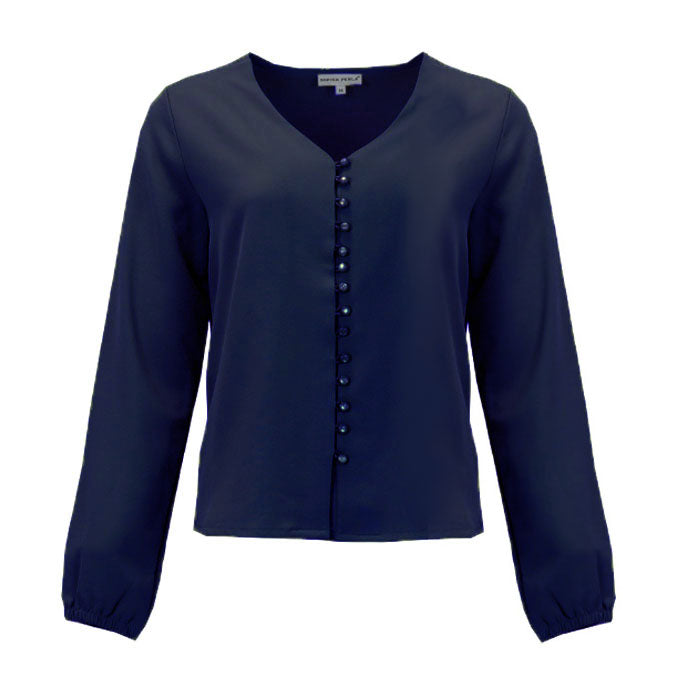 The Rima top has long sleeves, a V-neck and buttons at the front, which gives it an elegant look. The design is a nice balance between classic and modern. Available in multiple colors.