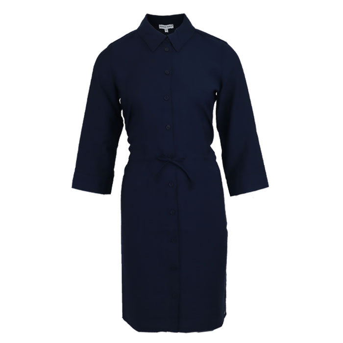 The River dress has three-quarter sleeves, a drawstring at the waist, V-neck and buttons at the front.