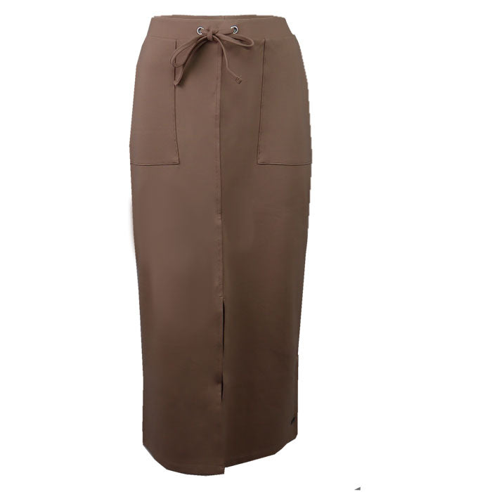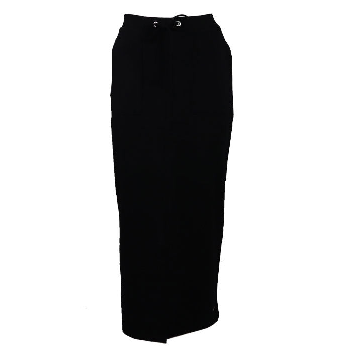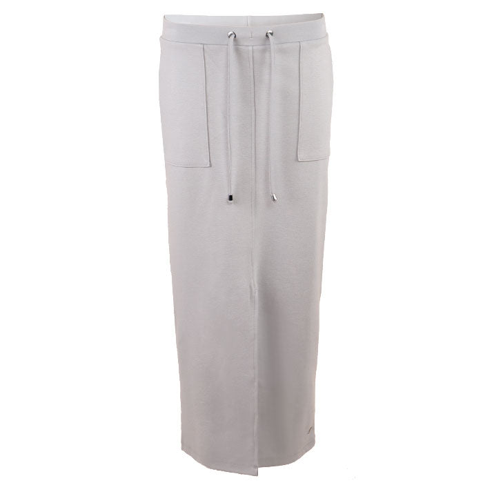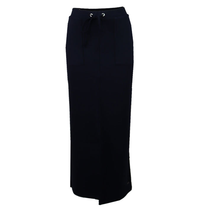 Lange Kristy rok van zachte knitted kwaliteit met stoere vierkante zakken. De split aan de voorkant zorgt voor een speels en vrouwelijk detail.