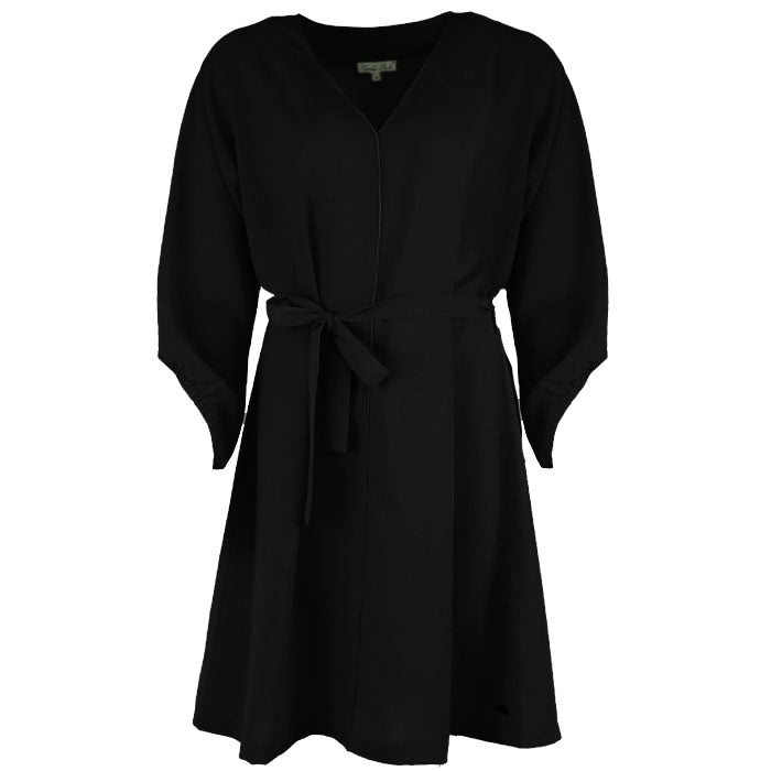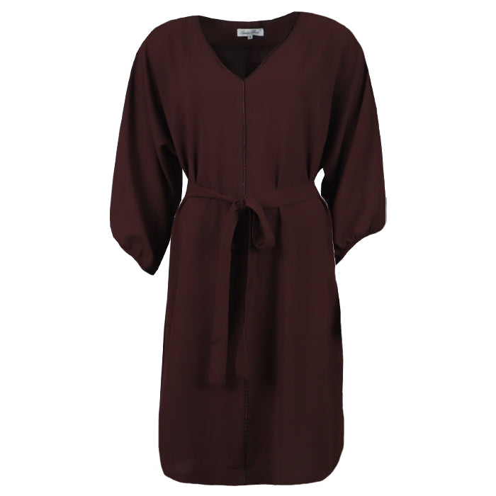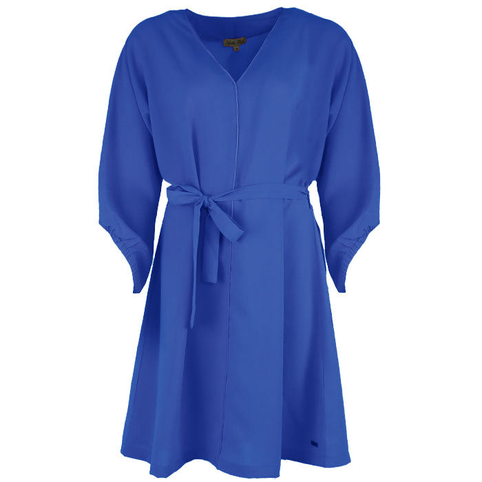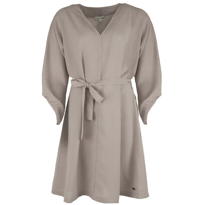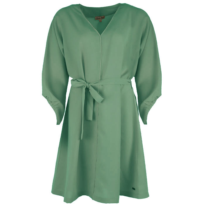 Deze jurk heeft een elegante V-hals met een verfijnd biesje als detail en een ceintuur om de taille mooi te accentueren. De schuin gesneden mouwen geven een speelse, vrouwelijke touch. Verkrijgbaar in meerdere kleuren.