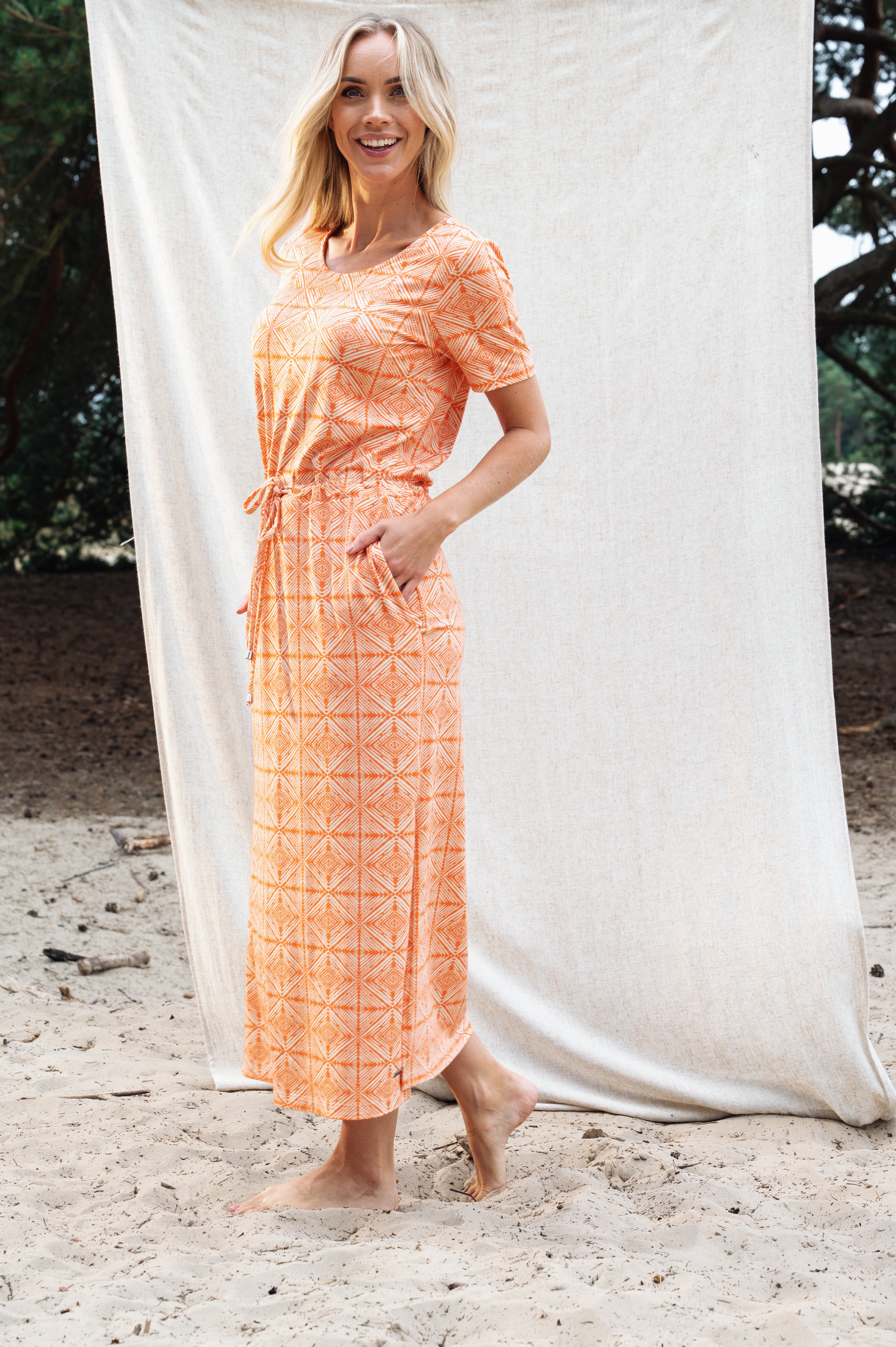 Deze jurk heeft een ronde hals met een subtiele V-uitsnede en een touwtje om de taille mooi te accentueren. Vrouwelijk, comfortabel en perfect voor elke dag.