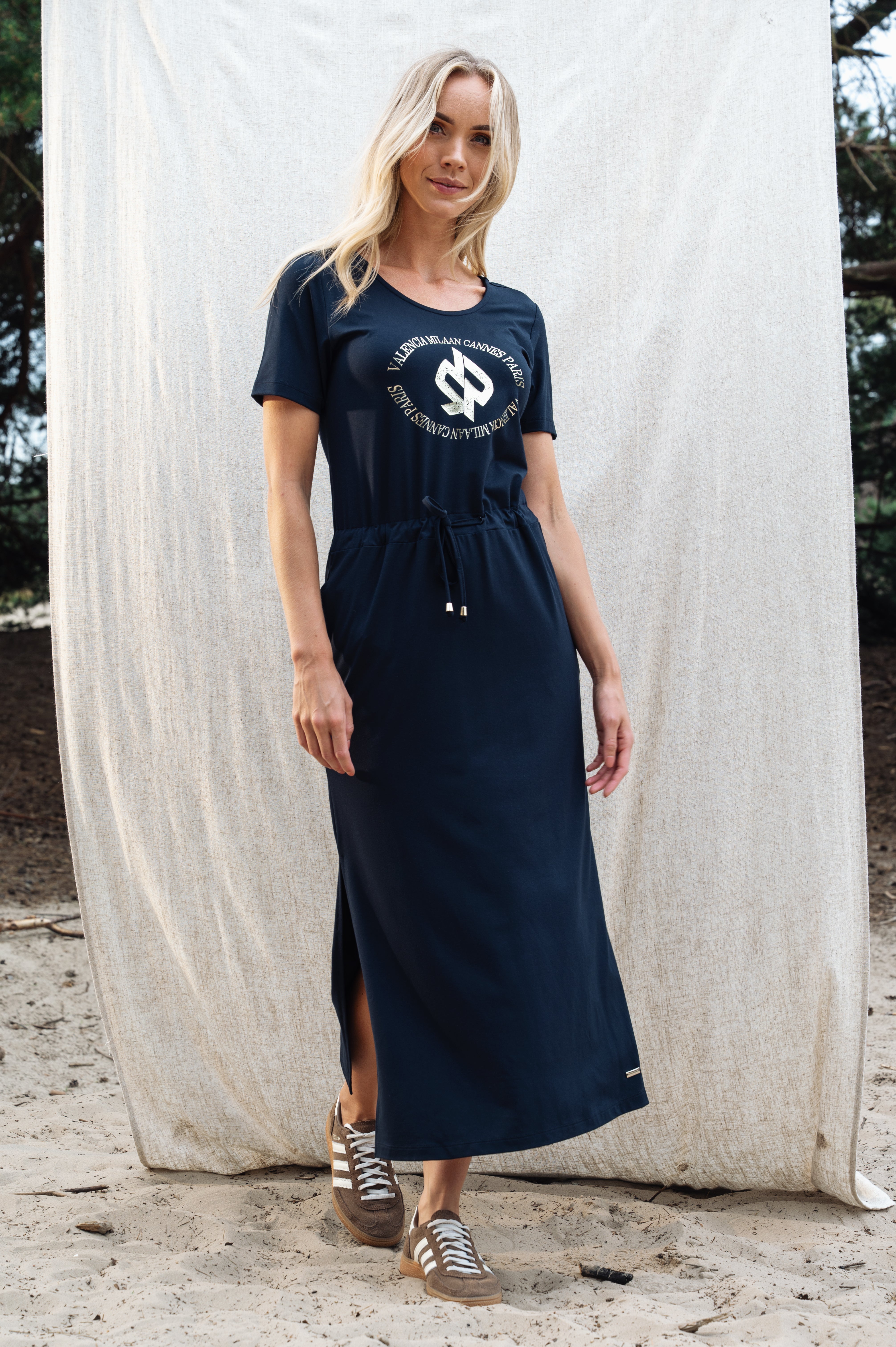 Deze jurk heeft een ronde hals met een subtiele V-uitsnede en een touwtje om de taille mooi te accentueren. Vrouwelijk, comfortabel en perfect voor elke dag.